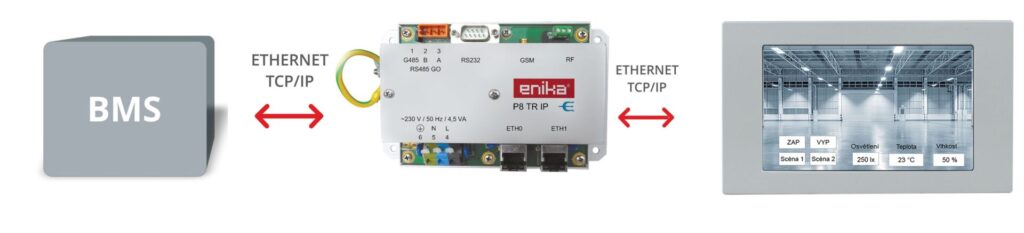 Díky modulárnímu řešení a otevřeným standardům, jako je MODBUS TCP, lze oba systémy snadno propojit. Komunikace mezi nimi probíhá přes běžné ethernetové rozhraní. U systému POSEIDON ® se jedná o jednotky pod označením P8 TR IP a P8 GWA DIN.